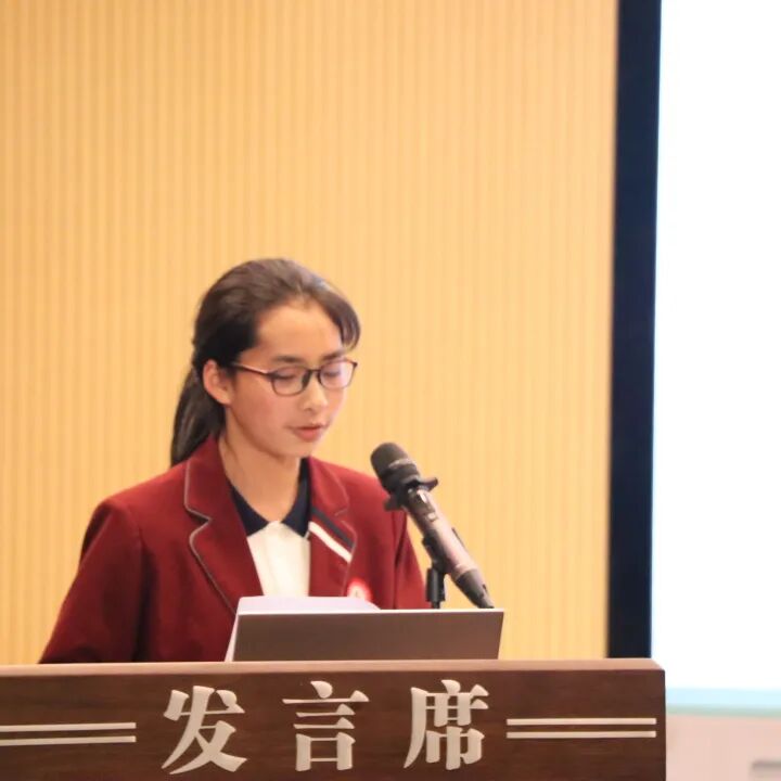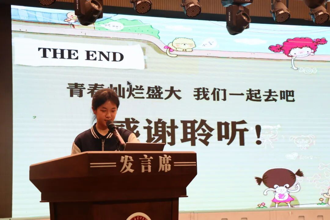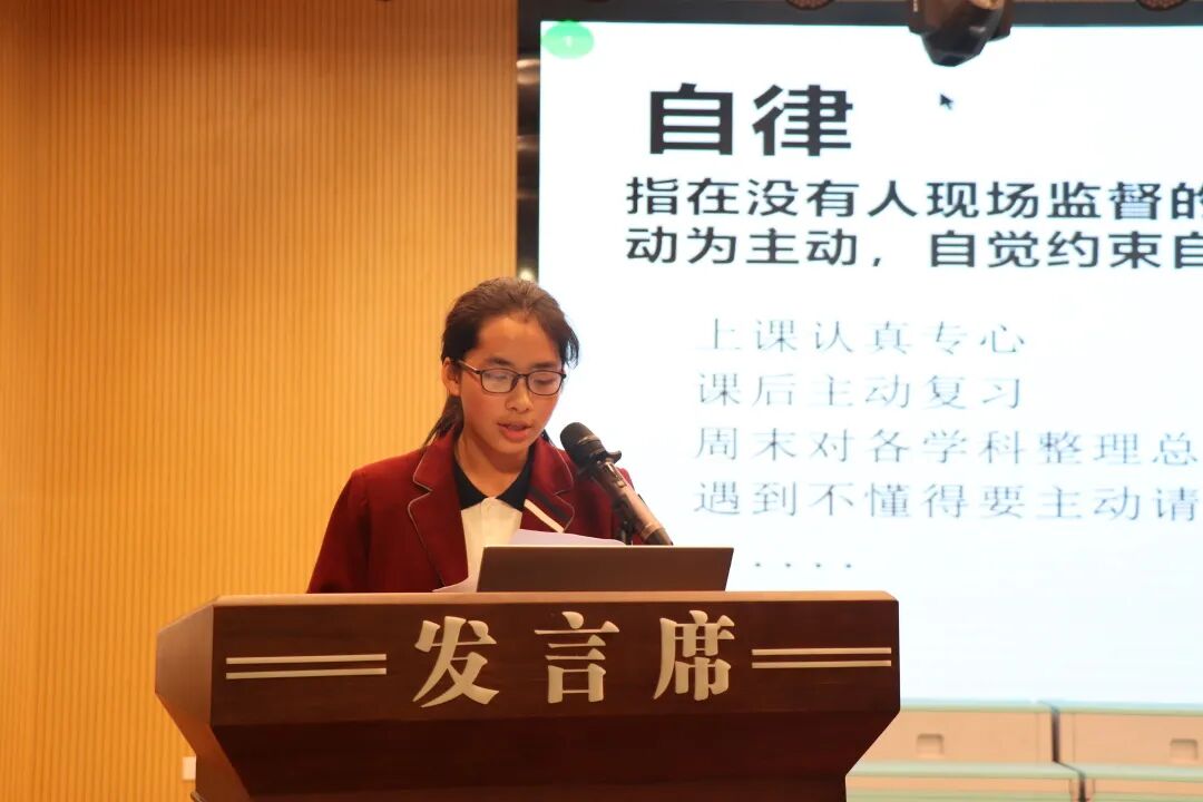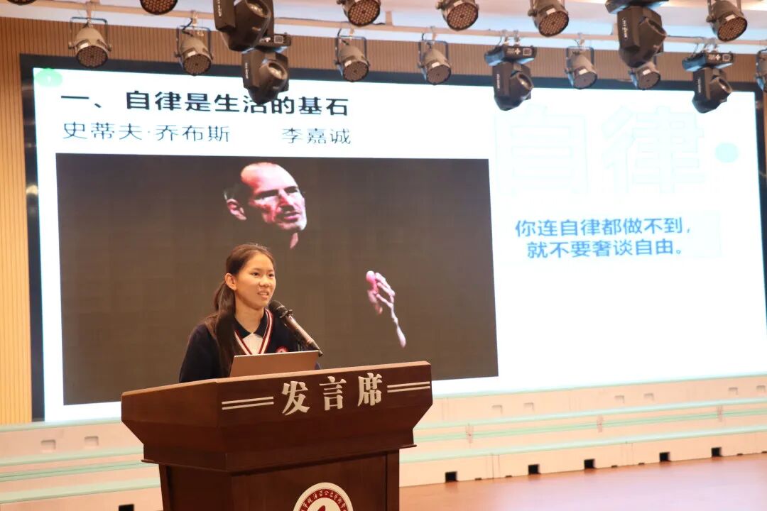 章熠硕同学举了几个名人例子:在冬奥会时摘得二金一银、为国争光的谷爱凌,人民艺术家老舍先生。他们是如何登顶职业巅峰的呢?还是离不开自律和百分百的付出。在最后,章熠硕同学也为全体同学送上了祝福,希望大家都能保持自律,走向成功。