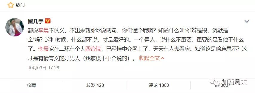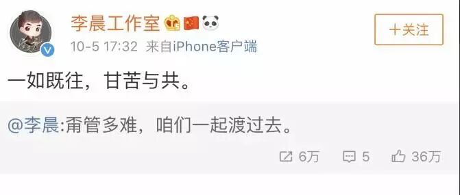 10月5日下午5时许,李晨发微博称:甭管多难,咱们一起渡过去。