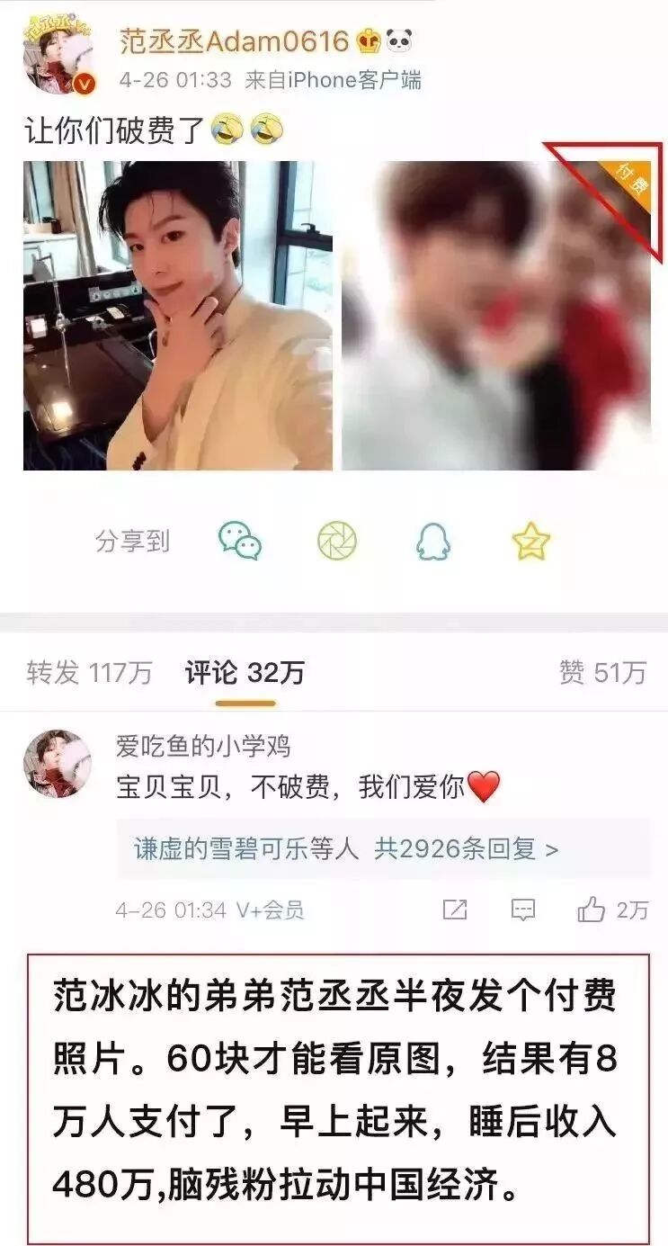 范丞丞还在微博上晒出“让你们破费了”的话,感觉上就像在嘲笑那些付费看他照片的“傻粉丝”们……
