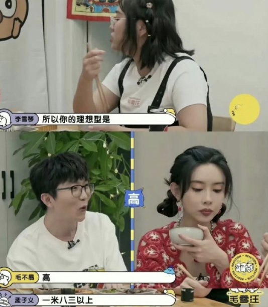 除了秦霄贤,孟子义也悄悄暗示过几次,孟子义曾经在节目上说,她的理想型是“高,一米八三以上,不用帅,幽默就行”。