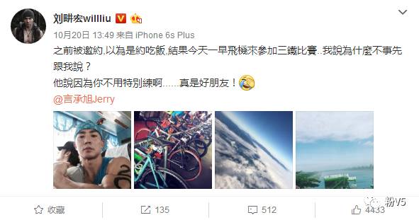 刘畊宏在演艺圈人缘佳,今日在微博透露好友言承旭私下无俚头一面,“之前被邀约,以为是约吃饭,结果今天一早飞机来参加三铁比赛。。我说为什么不事先跟我说?他说因为你不用特别练啊。。。。。。真是好朋友!”