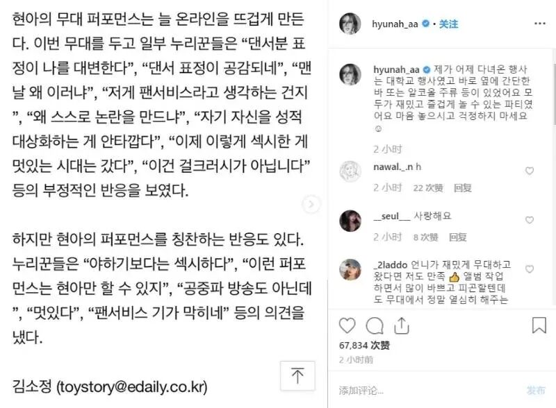 近日泫雅在校庆演出中途掀起裙子的行为引起争议,昨晚她在IG上正面作出回应了!