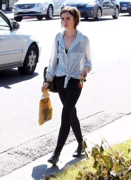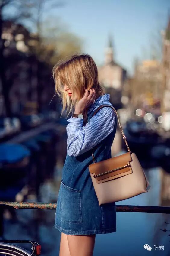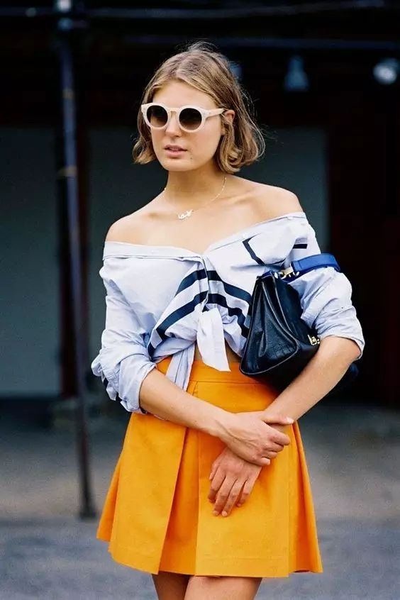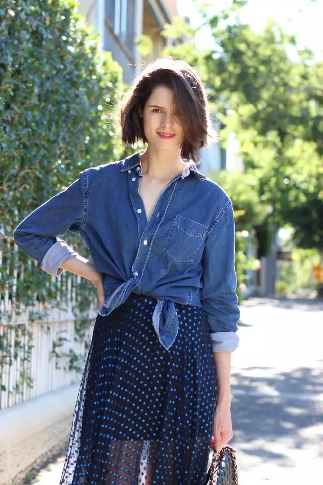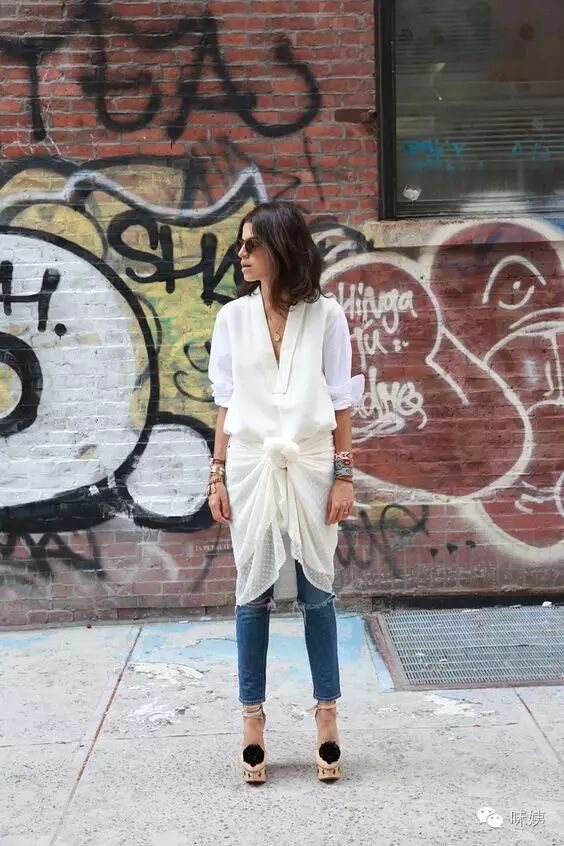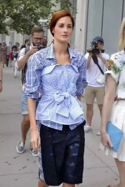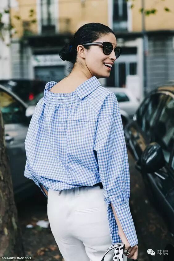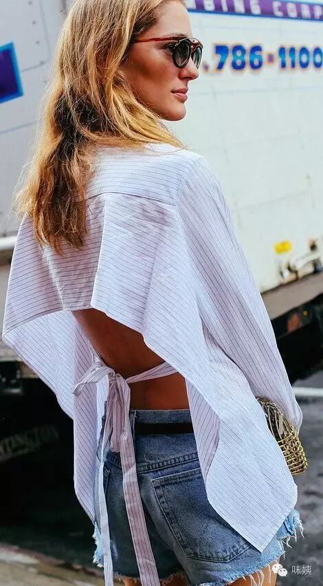 衬衫下摆打结是一个基础的穿搭tip,但是如果打结的位置换成了后背、肩部或者其他位置,这样小小的改变就能增加你的时髦指数。从后面看也是一道靓丽风景~