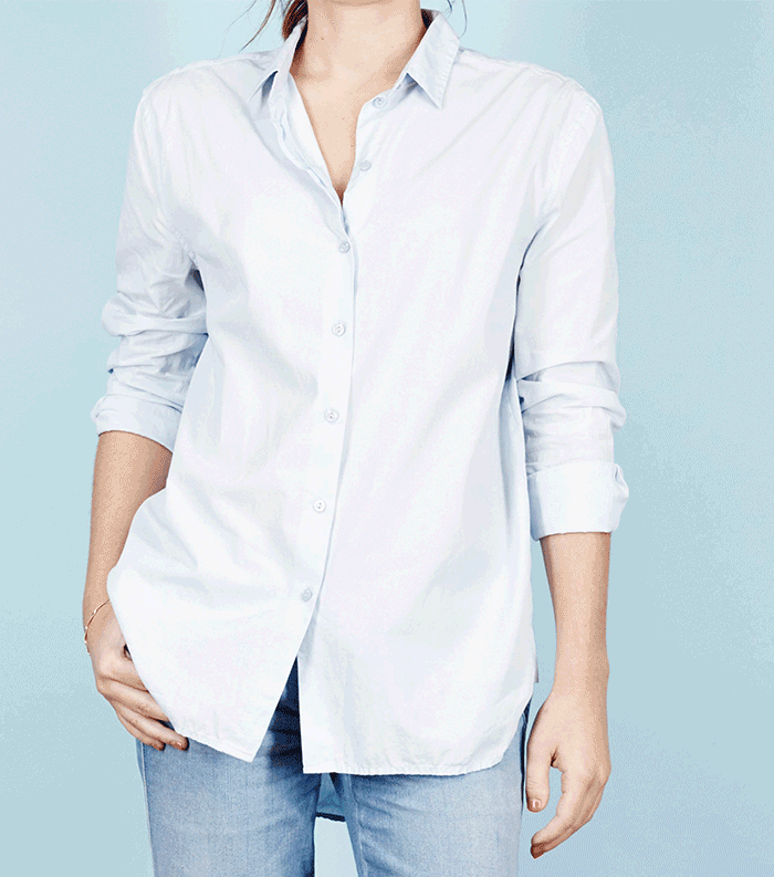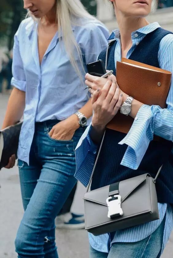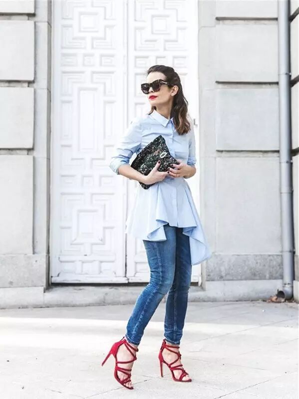 将衬衫前摆扎进下装,后摆随意放下,既能打造休闲潇洒的时髦腔调,又能遮盖不够完美的腰线臀型。这一举两得的衬衫穿法最适合在搭配牛仔裤装时使用,露出色彩对比、设计简约腰带,增添几分知性魅力。