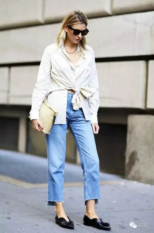 ▲旅居伦敦的时尚博主Camille Charriere这件米色条纹衬衫设计独特,腰际处的蝴蝶结细节格外抢眼,搭配时下最流行的毛边牛仔裤,演绎都市女生的潇洒风范。