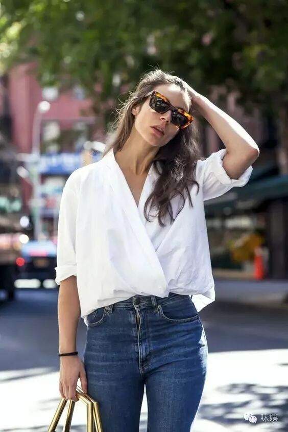 将基础款衬衫靠近领口的几粒纽扣解开,穿成露肩款,也是美得很惊艳哦!