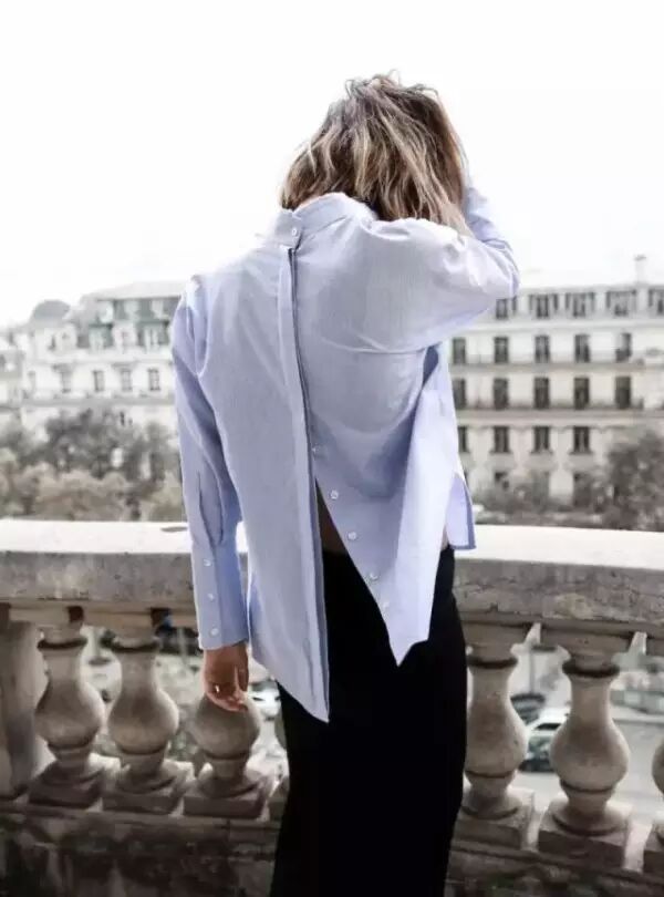 不知道这样穿会不会不舒服,不过时尚圈的人似乎也不care舒适这个问题,所以集好看、性感、时髦于一体的衬衫反穿大法才会如此受人追捧!