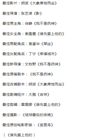 最佳导演是张艺谋,《影》的美也值得这个奖项,最佳男主角是徐峥,最佳女主角是谢盈萱,最佳男配角奖是袁富华《翠丝》女配则是丁宁,当然,不是打乒乓球的丁宁