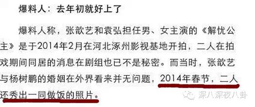 好好好说回内个爆料,就是有人说张歆艺跟杨树鹏离婚这事儿其实是因为张歆艺跟袁弘好了,而且在去年过年的时候就已经在一起了。而且剧组的人都知道他们同居??!!!!!