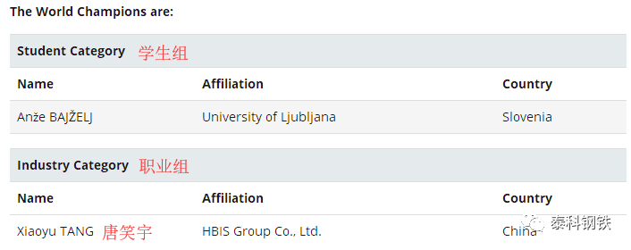 另外,据泰科钢铁小编查询到,2016年4月11日,世界钢铁协会宣布第11届模拟炼钢挑战赛世界总决赛冠军名单。来自中国河钢集团的周文涛赢得职业组冠军,来自中国台湾国立中兴大学的李佳峻赢得学生组冠军。就在今年3月初,周文涛当选第十三届全国人大代表、参加全国两会!(周文涛:1987年8月出生,2006年至2010年于东北大学攻读学士学位。现任河钢集团邯钢公司三炼钢厂精炼车间副主任)