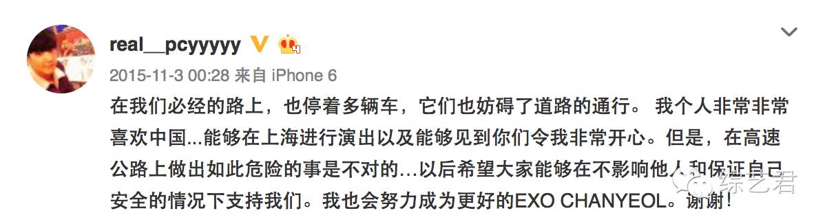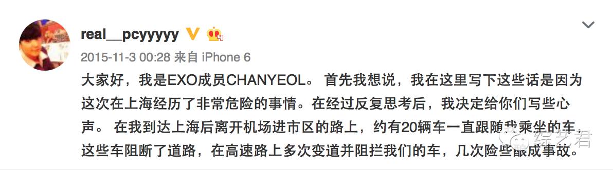 灿烈在去年来上海参加活动后被私生追车,险些酿成交通事故,之后灿烈在微博上连发两条斥责这种行为