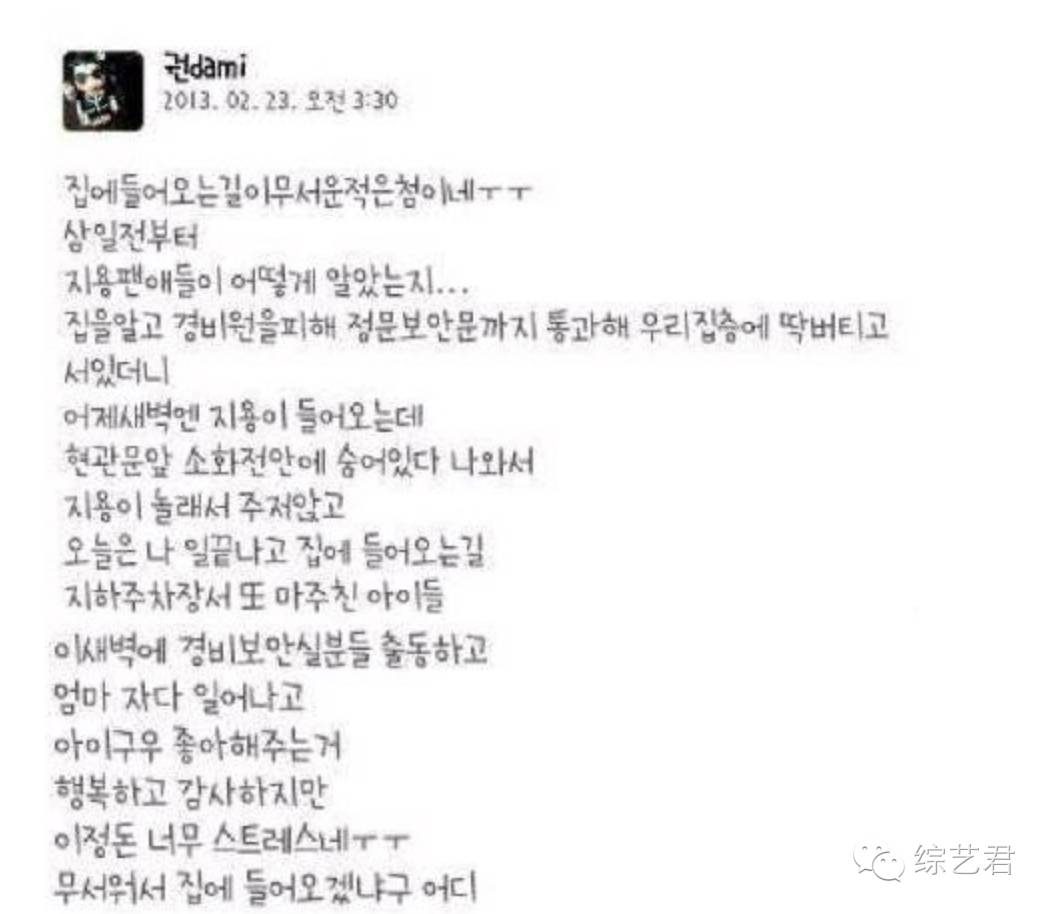 其实“私生饭”这个词应该是从韩饭圈传来的,这群人和饭圈的大大们又不一样,大大们都是扛着长枪短炮去拍爱豆工作的瞬间,而这些人则是偷拍爱豆的私生活!而爱豆们的私人时间也完全被这些人破坏,任何的行踪和信息都会被他们随时监控着。