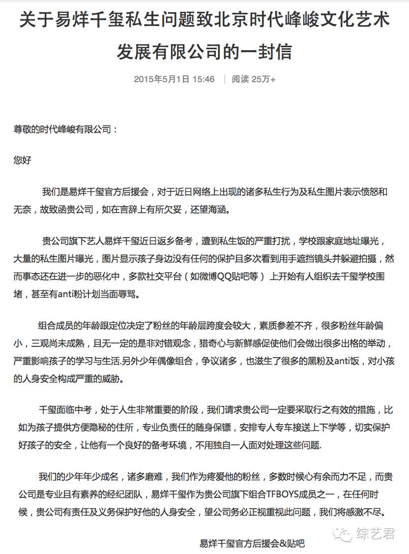 逼得千玺的后援会和贴吧都联合向公司写信抗议以让公司重视私生问题