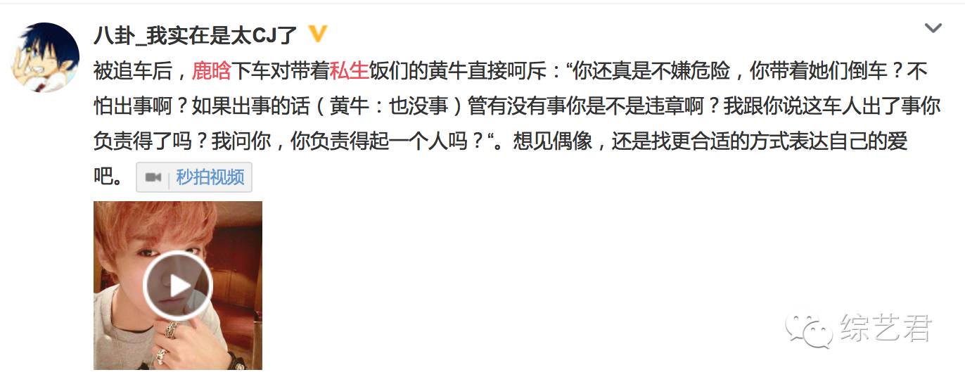 还有就是前段时间被传的沸沸扬扬的鹿晗怒斥跟车私生之后反被私生摆了一道的事情了吧