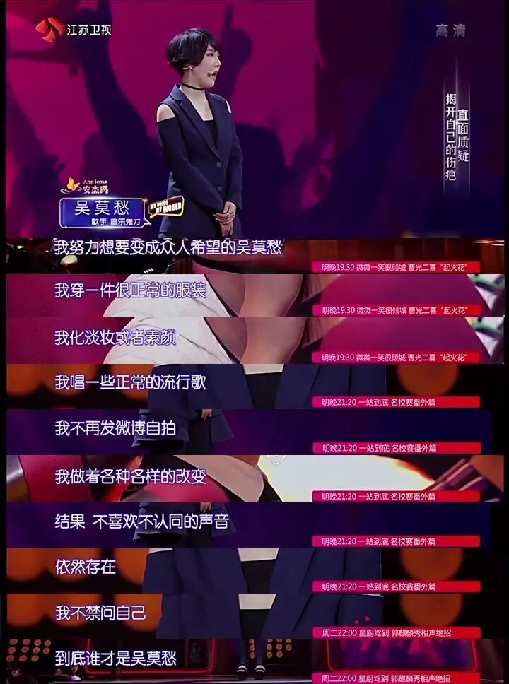 然而这些并没有给吴莫愁带来真正的快乐,质疑与不喜欢的声音依旧存在,就像她第一次登上演讲节目《说出我世界》时说的那样,她已经不知道到底谁才是真正的吴莫愁。