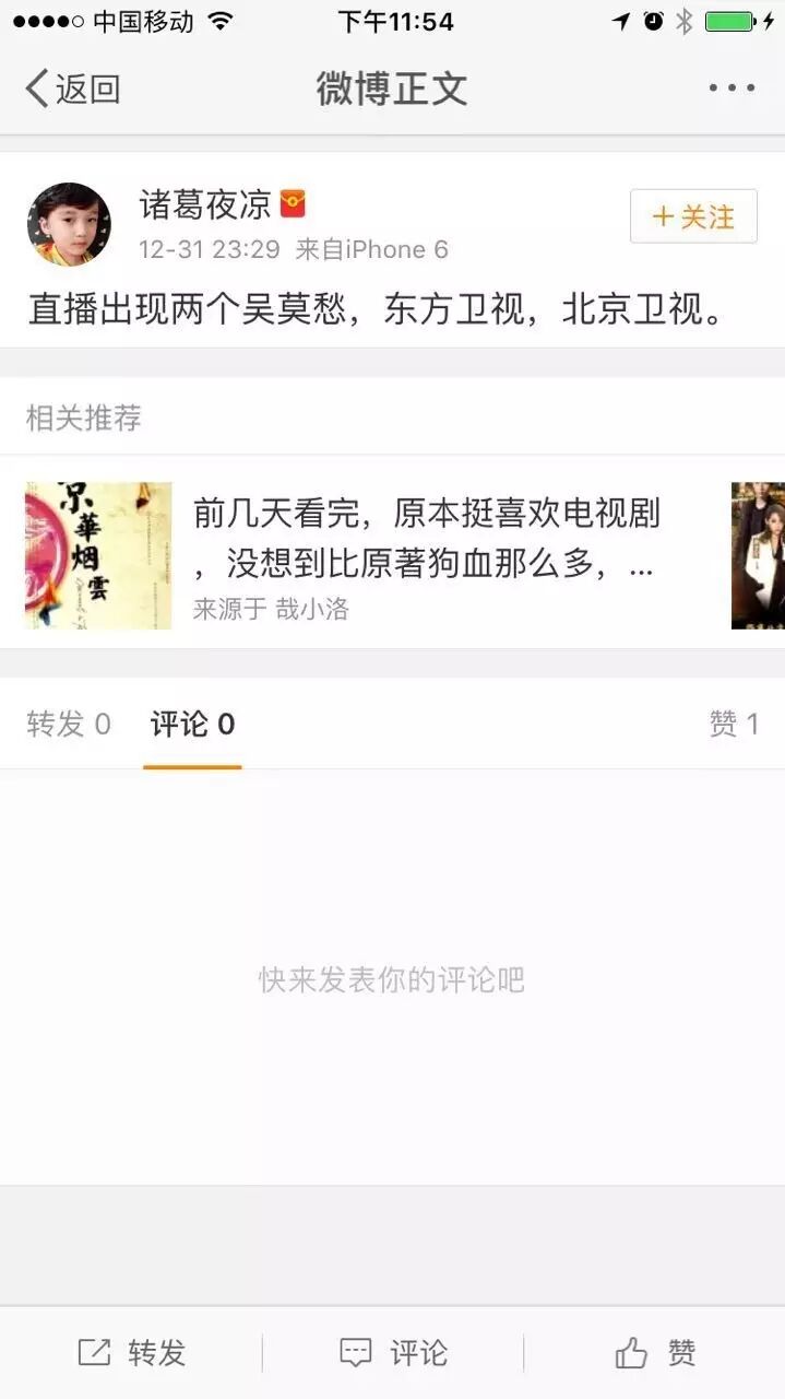 最有意思的是,吴莫愁这个奇女子,竟然在一个晚上同时霸屏北京卫视和东方卫视两家卫视的跨年晚会啊!难道吴莫愁有江湖失传已久的秘术——影分身之术?