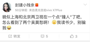 面对“穿越”了的吴莫愁电视机前的吃瓜群众纷纷表示,北京卫视和东方卫视“撞人”啦、同时出现两个吴莫愁啦,想必看到吴莫愁同时出现在两家跨年晚会上,大家都是一脸懵逼。