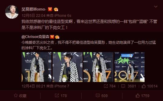 除了搞怪,耿直起来的吴莫愁也是相当霸气!在之前的爱奇艺尖叫之夜,吴莫愁一身黑白斑点大衣搭配黑色衬衣+卡通图案短裙亮相红毯,说实话,虽然这身造型并不是所有人的style,但的确是吴莫愁一直以来的个性风,还是没能挡住一些“毒舌”网友讽刺吴莫愁的造型像是“用力过猛的涂料厂下岗女工”。