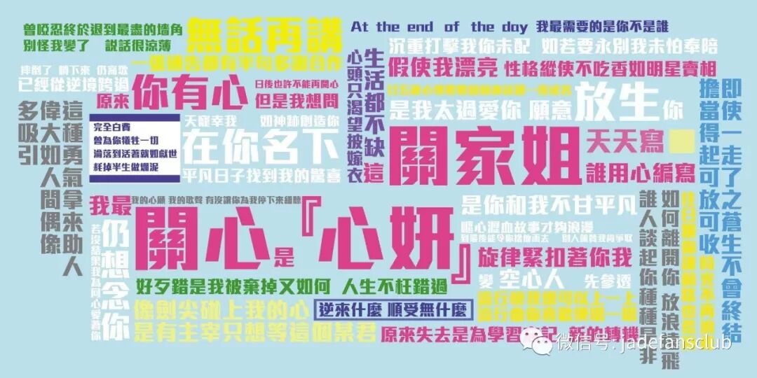 除了傳統的party氣球裝飾,今年生日會現場加入了發光氣球和小燈飾,小燈夾夾著過往心妍演出的照片,一齊回憶過去;也有字母JADE字樣的燈飾擺件,大家都知道Jade有不少作品,好多經典歌詞句子,今年生日會也在背景墻呈現出來,歌詞海報上有不少經典歌詞句子,相信大家都非常熟悉。(經典歌曲讓大家一起回味)
