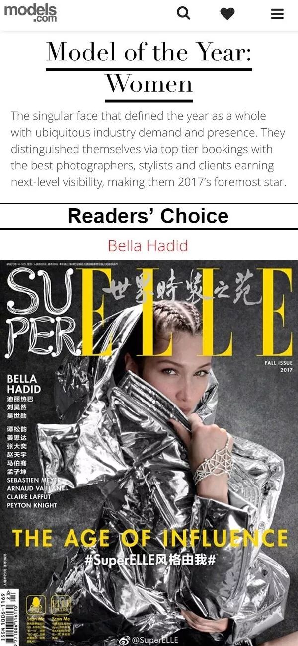 ▲值得一提的是,在2017年底,Bella还荣获读者票选出来的年度模特!