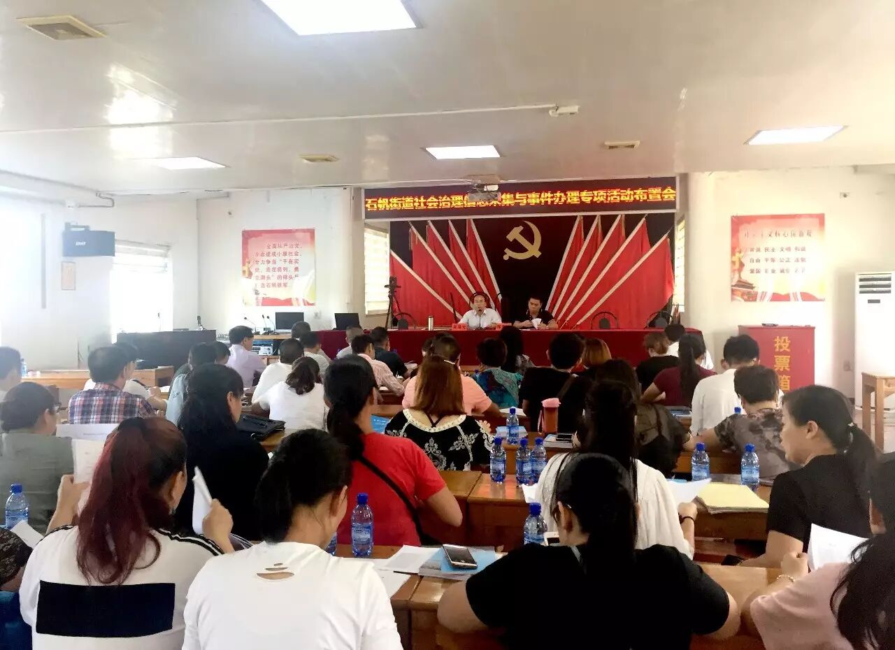 为进一步做好街道社会治理信息采集与事件办理工作,摸清网格基础信息,深入推进全科网格工作和提升“平安三率”,8月2日,石帆街道召开社会治理信息采集与事件办理专项活动布置会暨平安宣传工作布置会,街道综治办、计生办等相关职能科室工作人员和全体全科网格员参加了会议。