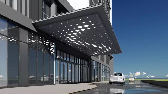8米挑高玻璃大堂、细部精致的门窗套设计、B2和B3高层的形象入口大雨蓬,是整个二期高层设计的点睛之笔,其中的大雨蓬仿佛是漂浮的飞船悬停于空中。