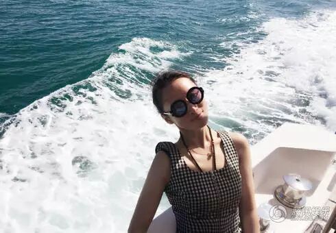 蒋勤勤戴着墨镜在游艇的一端,面带微笑,看上去心情很好。