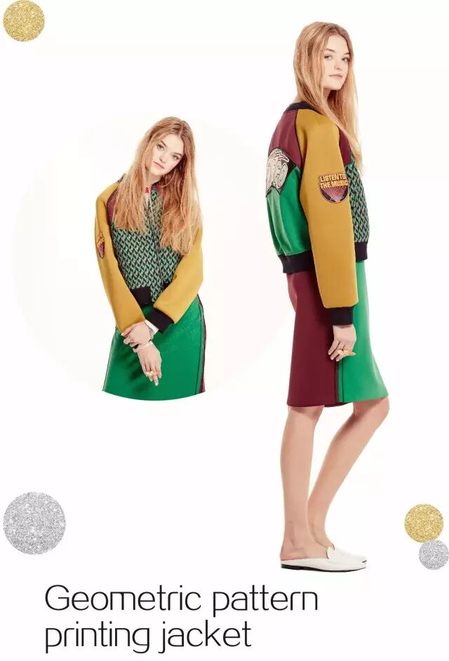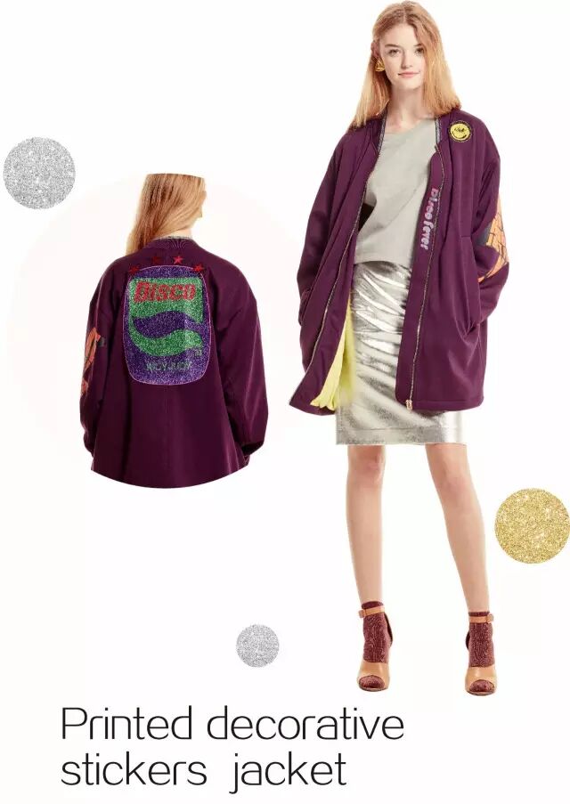 立体笑脸拼贴与个性字母印花装饰简版外套将街头文化诠释得恰到好处,休闲的卫衣内搭大胆搭配金属亮银短裙与今季大势彩色亮金属丝短袜将复古Disco风与休闲街头感完美融合。