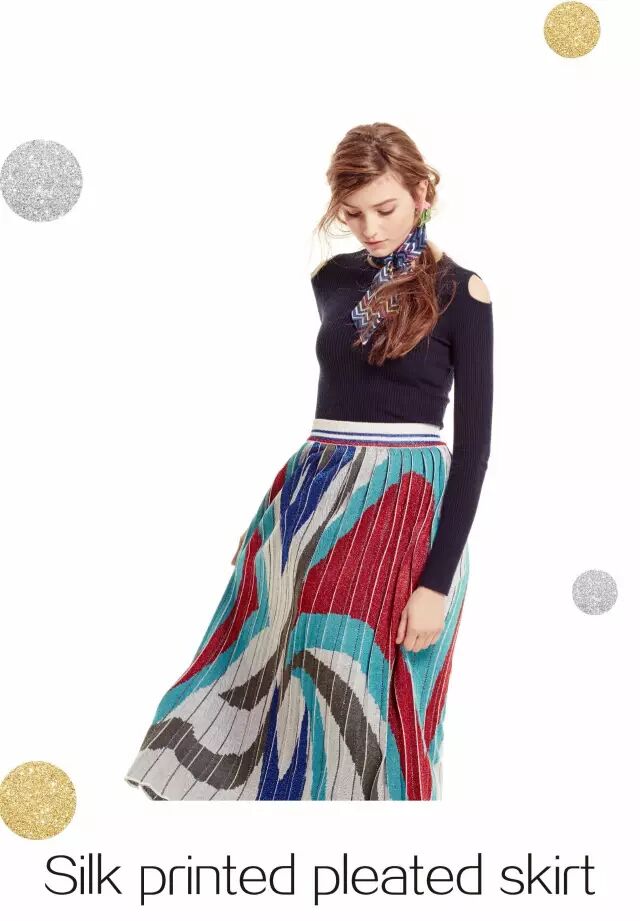强烈大胆的撞色个性印花绝对是征服时尚的终极武器!金属丝提花百褶半裙结合复古艺术感十足的抽象印花牢牢锁定视线!露肩纯色打底衫是饱含心机的最佳搭配单品,为空荡的脖颈搭配彩色印花丝巾带来绝妙的平衡感。