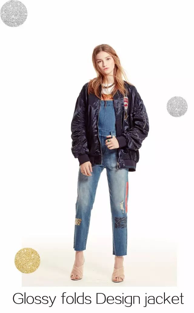 光泽感十足的亮面棒球外套与闪亮复古Disco印花装饰贴结合时髦感满分!袖窿褶皱设计更加独特个性。搭配动物纹拼贴装饰水洗背带裤与印花白T将OLD-SCHOOL风与美式工装风完美融合。