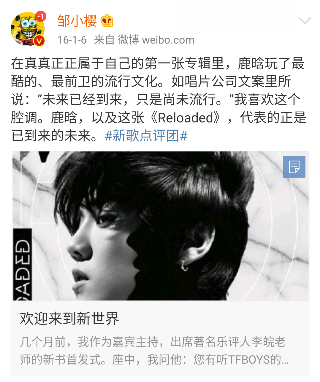 乐评人邹小樱评价鹿晗专辑《Reloaded》 / @邹小樱