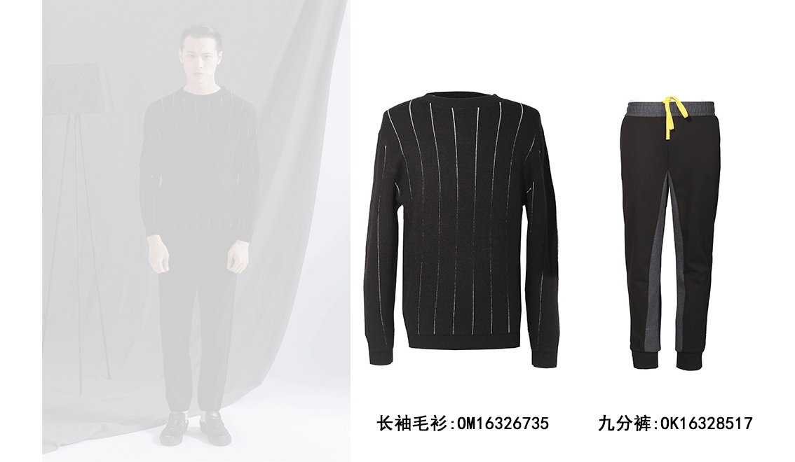 长袖毛衫,合体版型,黑白条纹图案经典大气,高档精纺羊毛混纺纱,织法紧密具有质感。