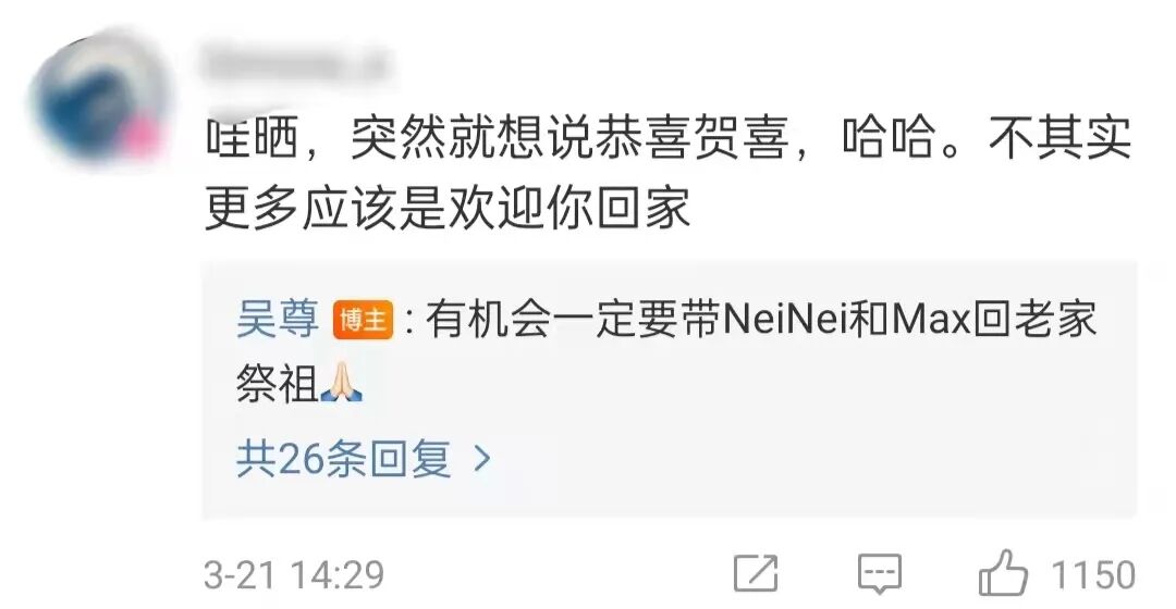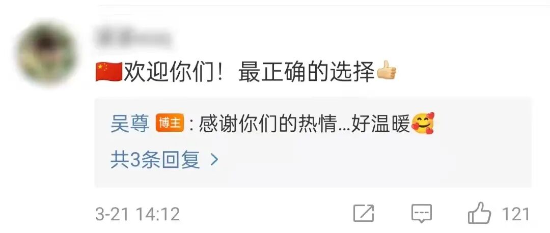 网友看到后也是纷纷送上祝福,有人说到“欢迎在国内定居”“欢迎你们”,吴尊也是积极回应大家的祝福说到“感谢你们的祝福,好温暖”。更有网友说“希望你们在中国生活愉快,小朋友们可以茁壮成长”。