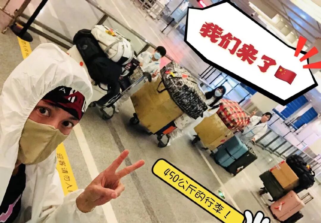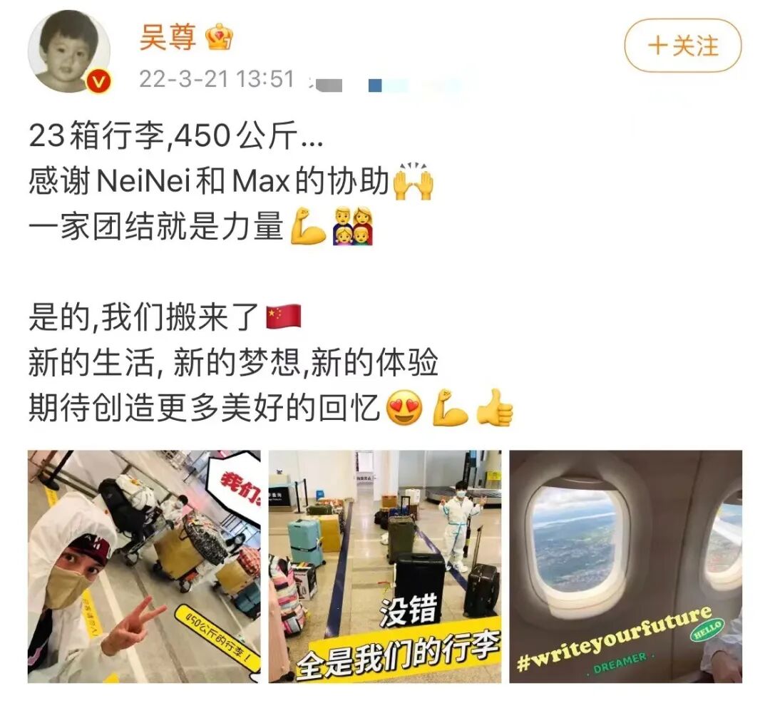 吴尊还发了自己自拍角度的一家人合影,老婆和两个孩子分别站在很多行李面前,几乎快要被行李遮住,四个人都穿着隔离服,防护措施做得很好,看得出来他们都很开心。