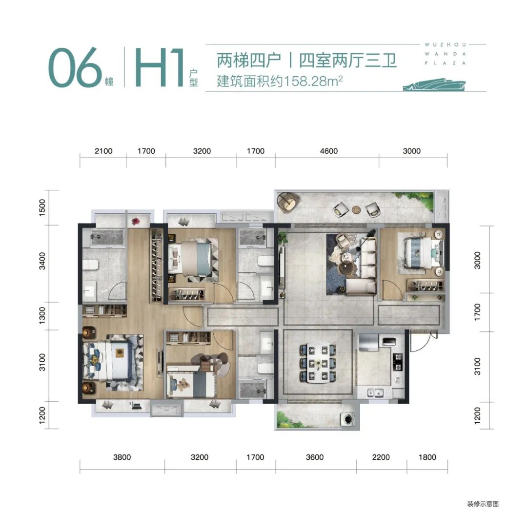 建面约130㎡宽奢四室,超阔主卫