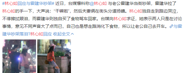 这件事发生之后,林心如的回应得很快,她说自己跟霍建华就是讨论事情而已:“我们只是意见不同啦,后来我自己坐出租车回去了。”