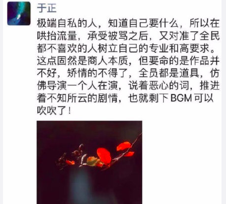 于正朋友圈疑似流出,他指责某人哄抬流量、商人本质、全剧仿佛只有导演一人演、只有bgm可以吹....