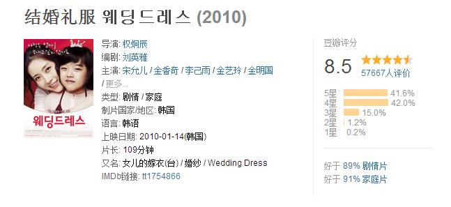 10年主演了被誉为泡菜催泪代表作的《婚纱》,向观众细述了一段离别在即的母女情。电影不仅打动了泡菜国民,豆瓣的评分也高达8.5,真不愧是韩剧女神啊!!!