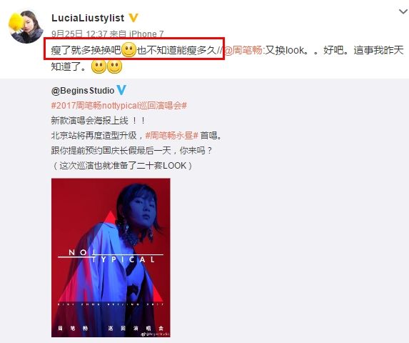 lucia在微博上开玩笑地说:瘦了就多换换(LOOK)吧,也不知道能瘦多久。粉丝们纷纷评论求监督,让她再瘦几斤。