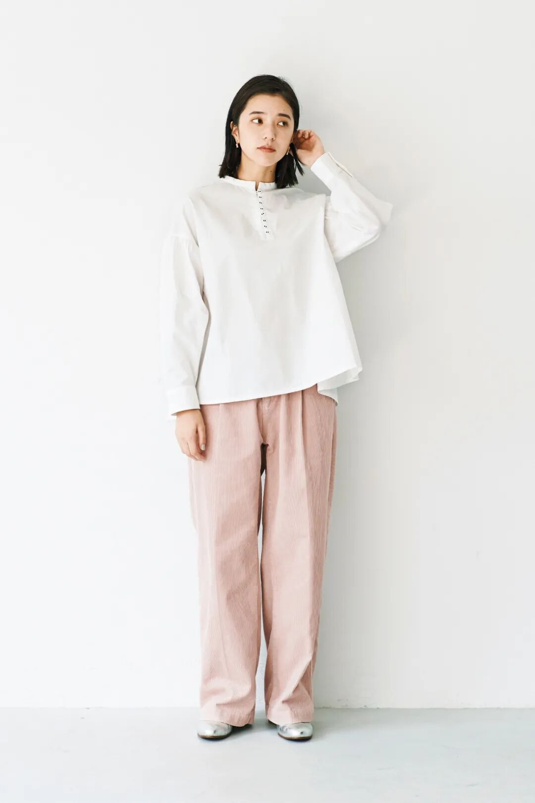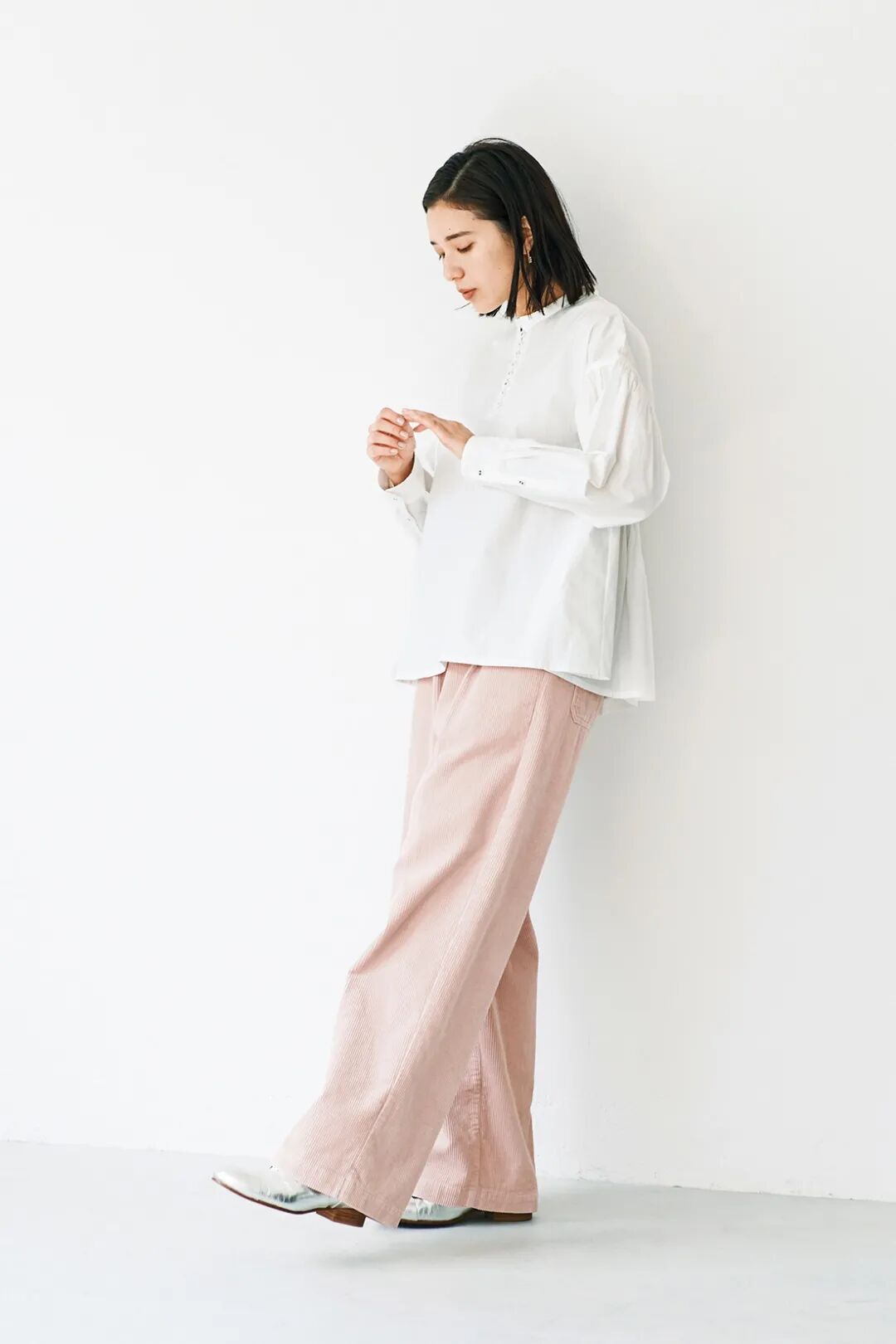 胸前的纽扣增加了白衬衫的保守程度,显得气质高雅,搭配冰淇淋粉色阔腿裤注入适当的少女味道,整体造型不会太老气。