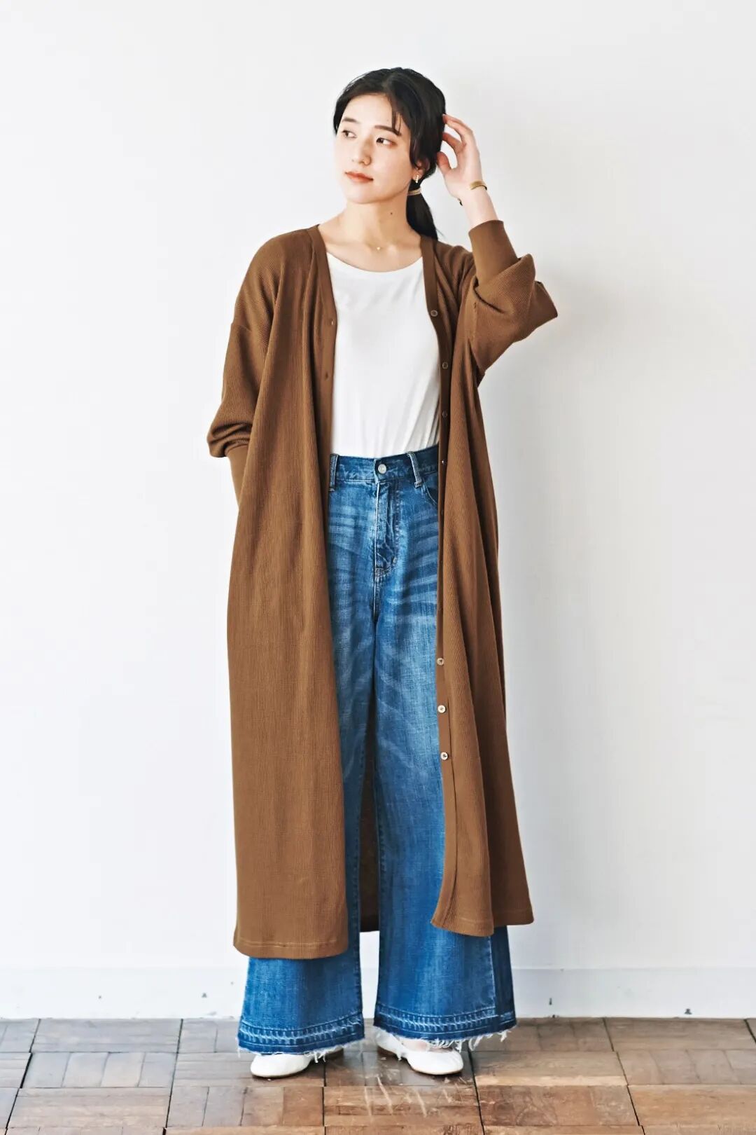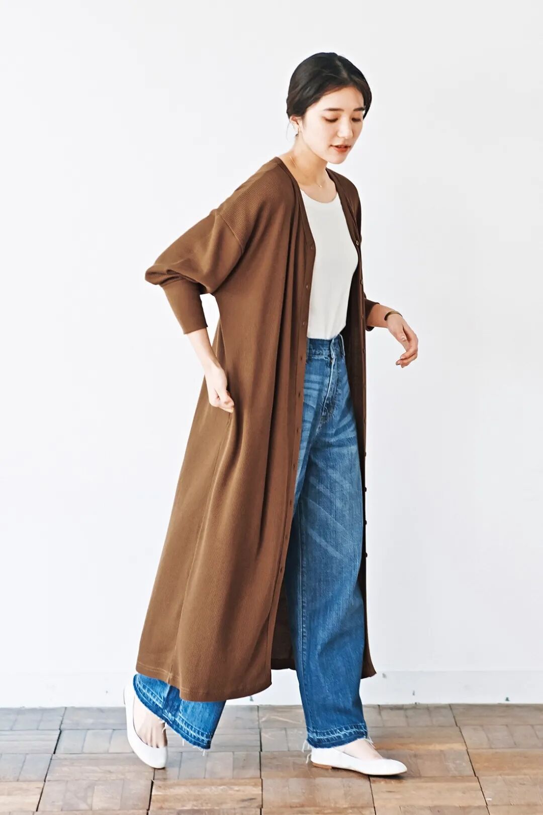 长款卡其色针织衫不厚不薄的面料,拥有不错的垂顺感,显得身材纤长气质佳。