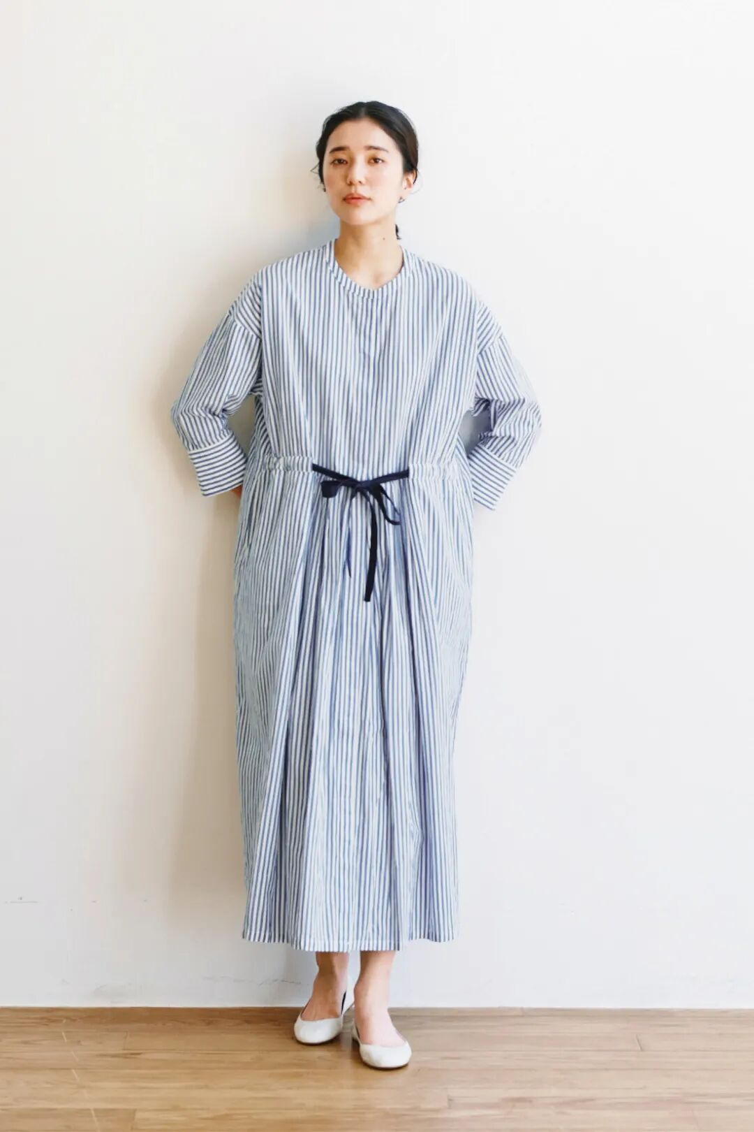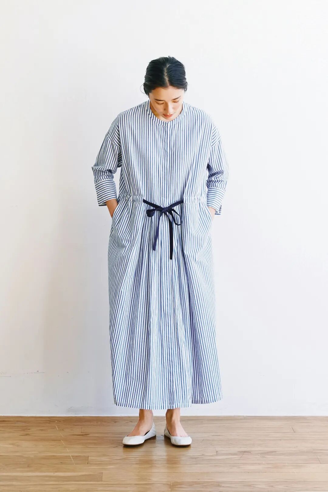 竖条纹衬衫裙勾勒出日系文艺风,腰间的系带可松可紧,随意调节身材。