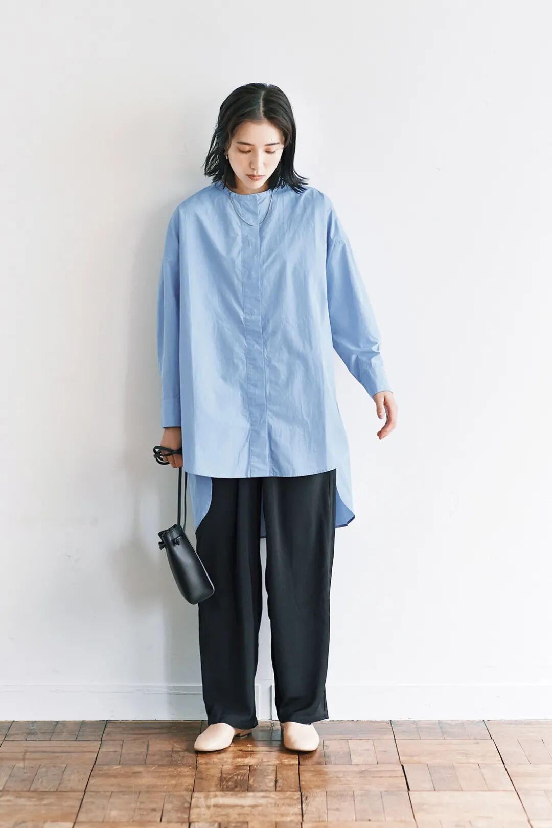 冷调的蓝色衬衫更能放大清冷的气质,前短后长的不规则设计凸显时尚感。