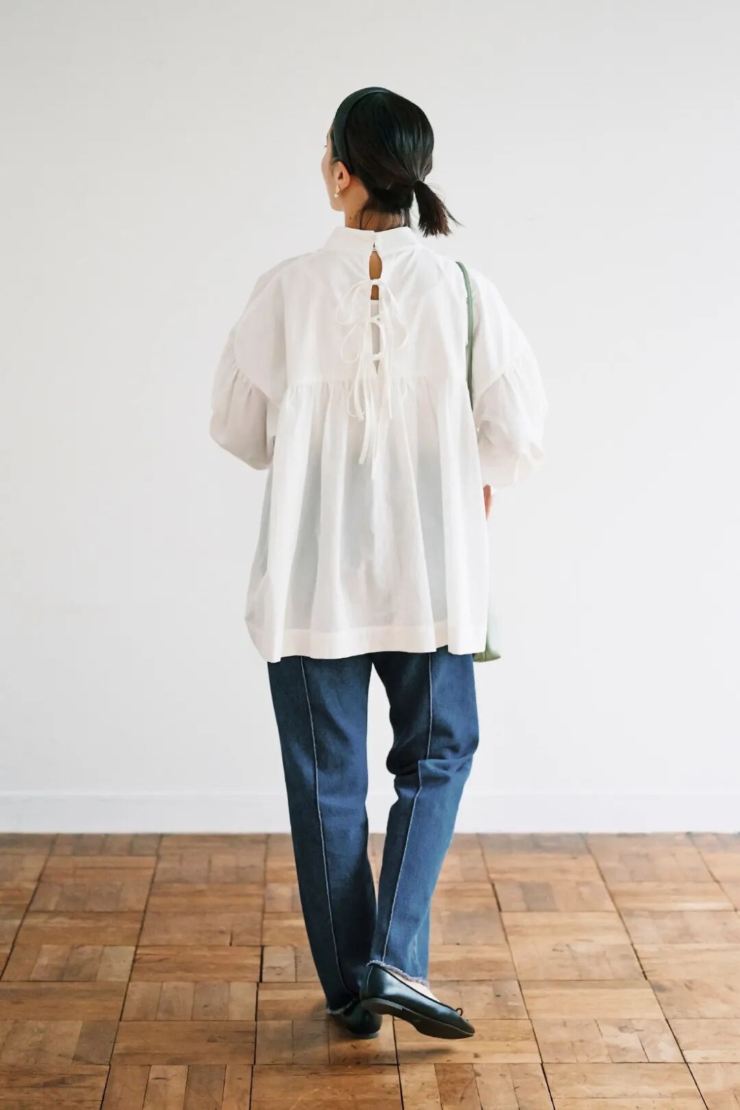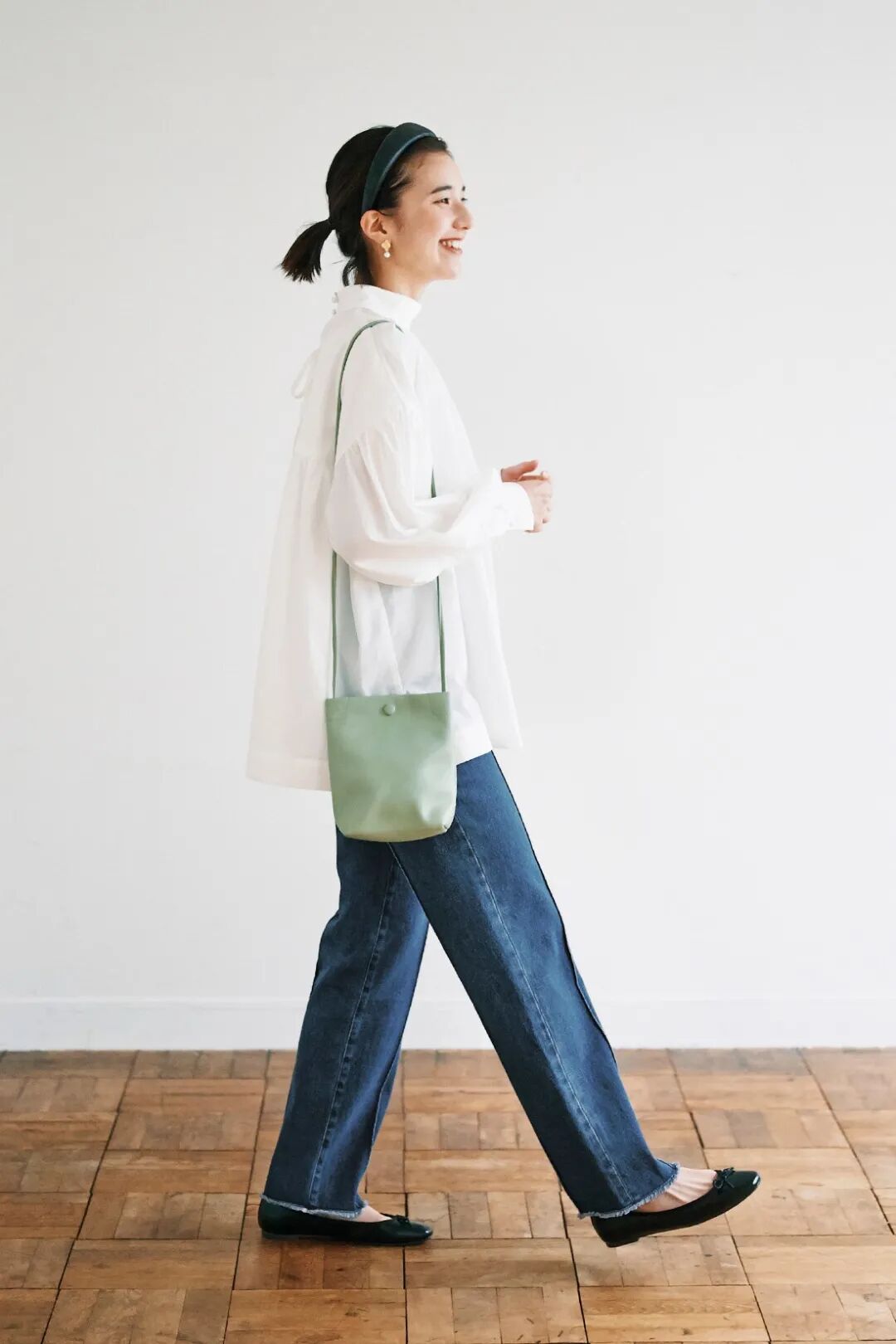 白衬衫+牛仔裤轻松穿出文艺小清新风范,背后的蝴蝶结抽绳设计透露出小心机,搭配mini bag清爽出街。