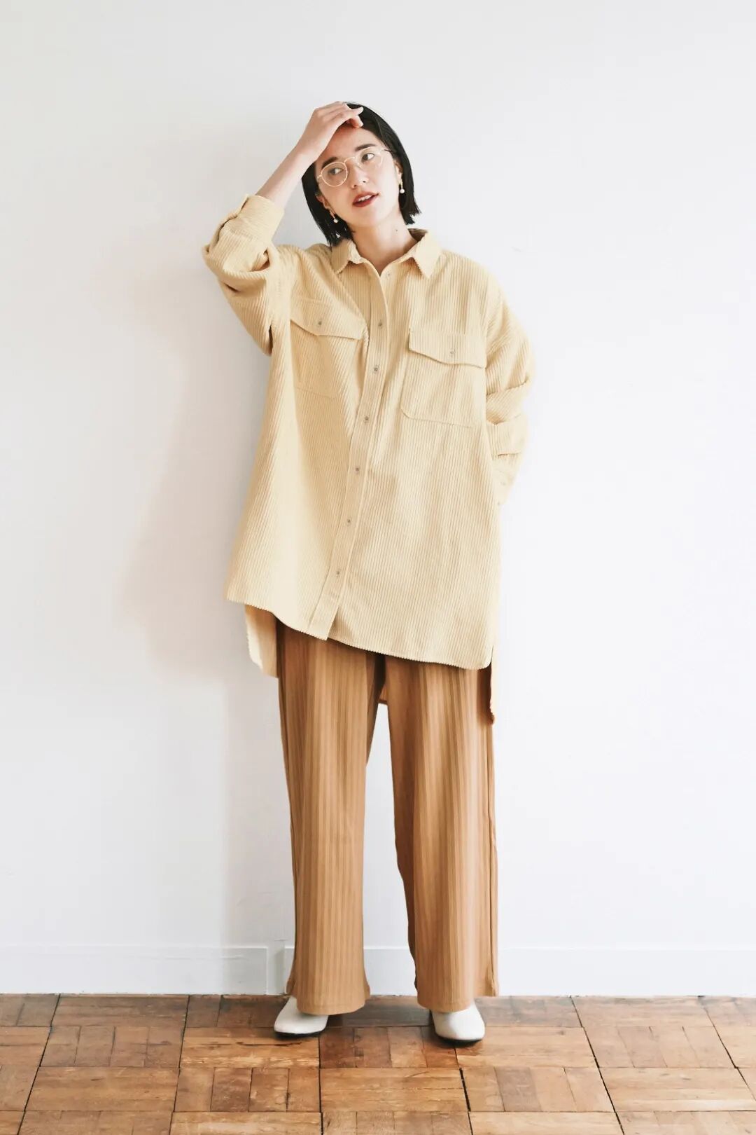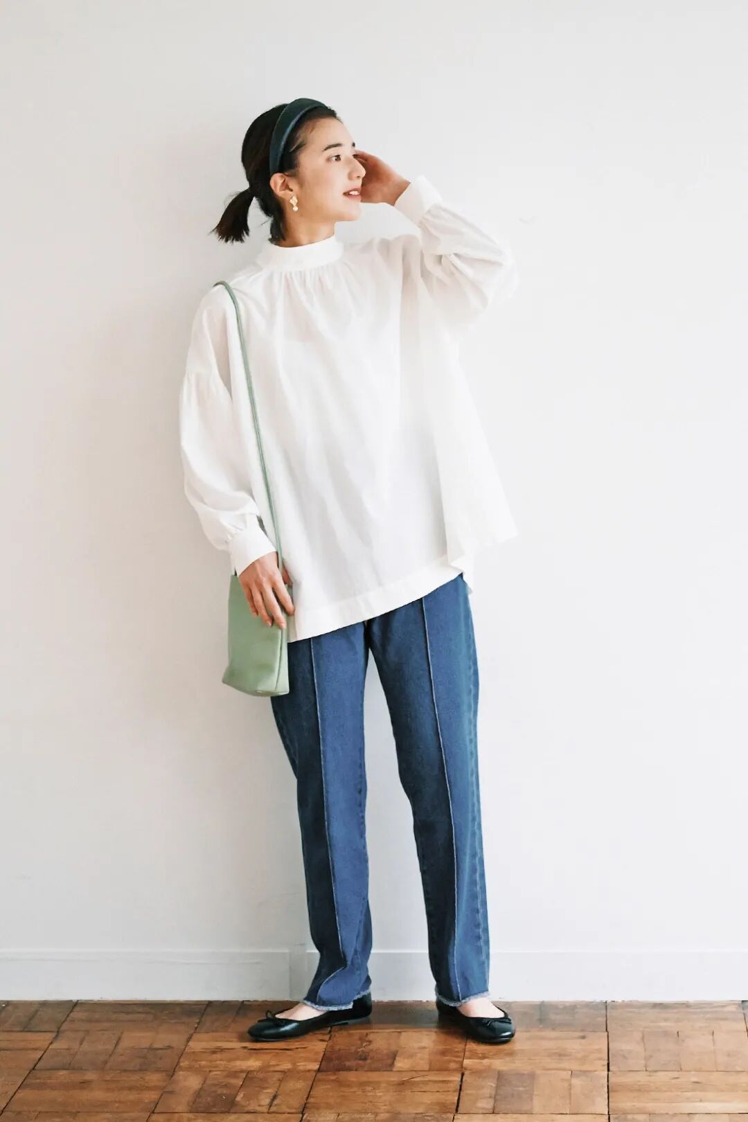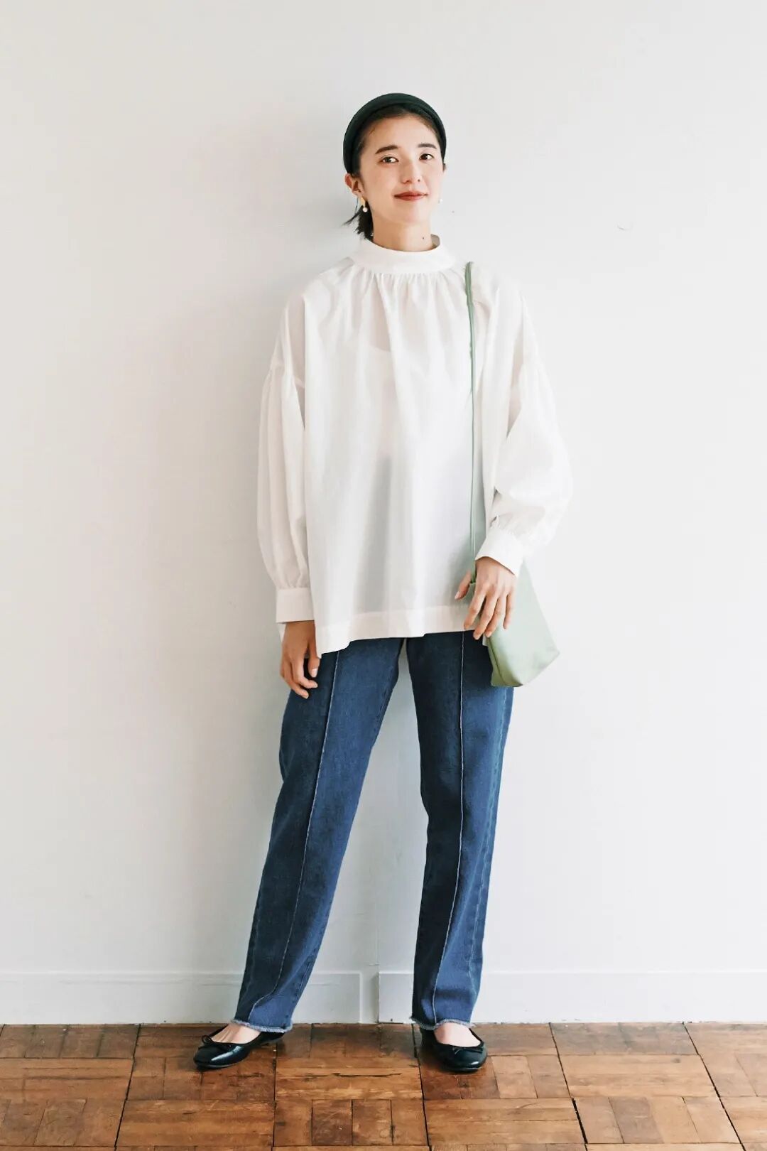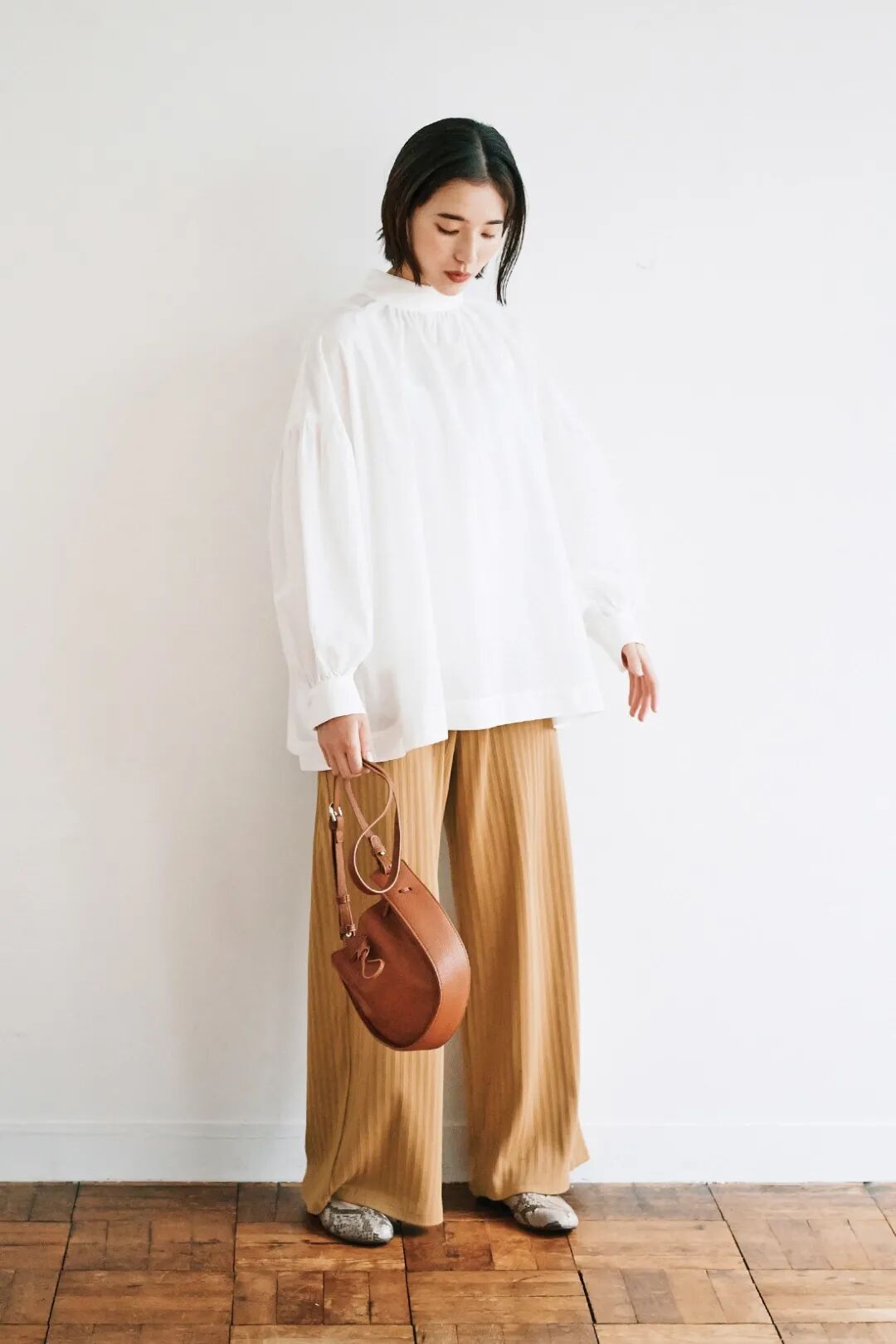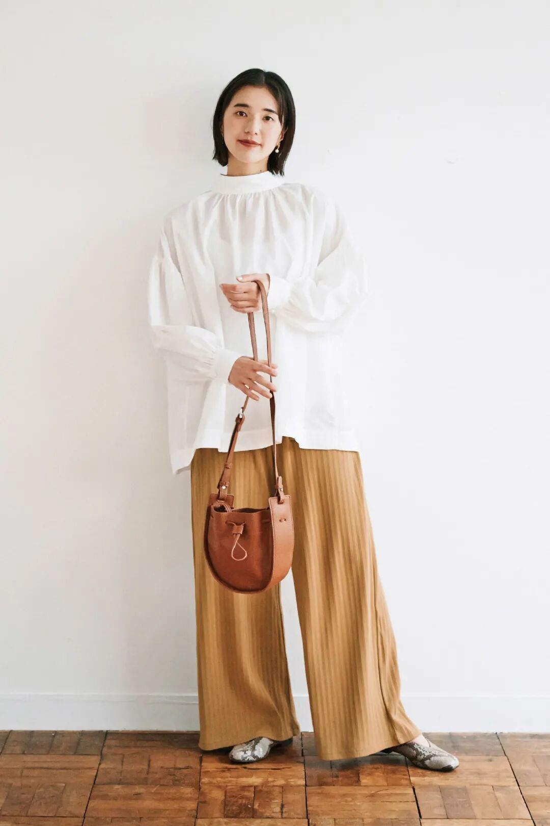 领口与袖口的收口设计,让宽松的白衬衫有了一定程度的收敛,不会显得太膨胀,即便搭配松散的阔腿裤,整个人都不会显胖。