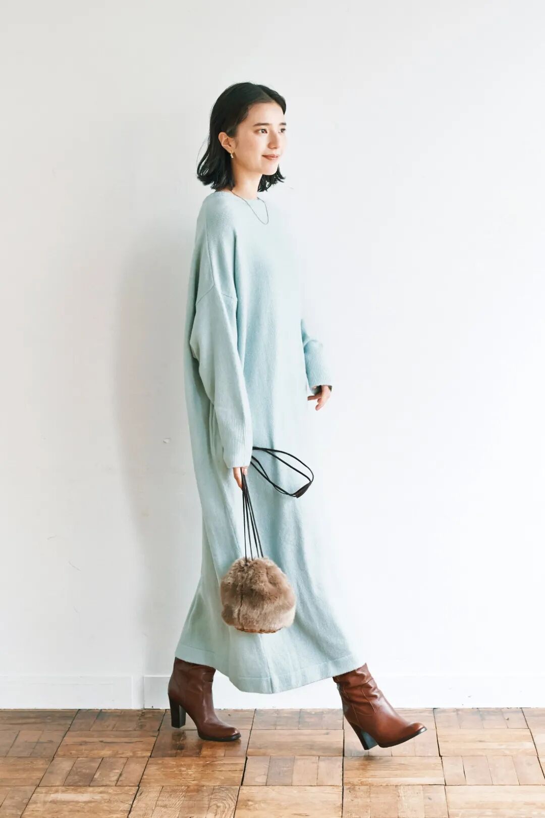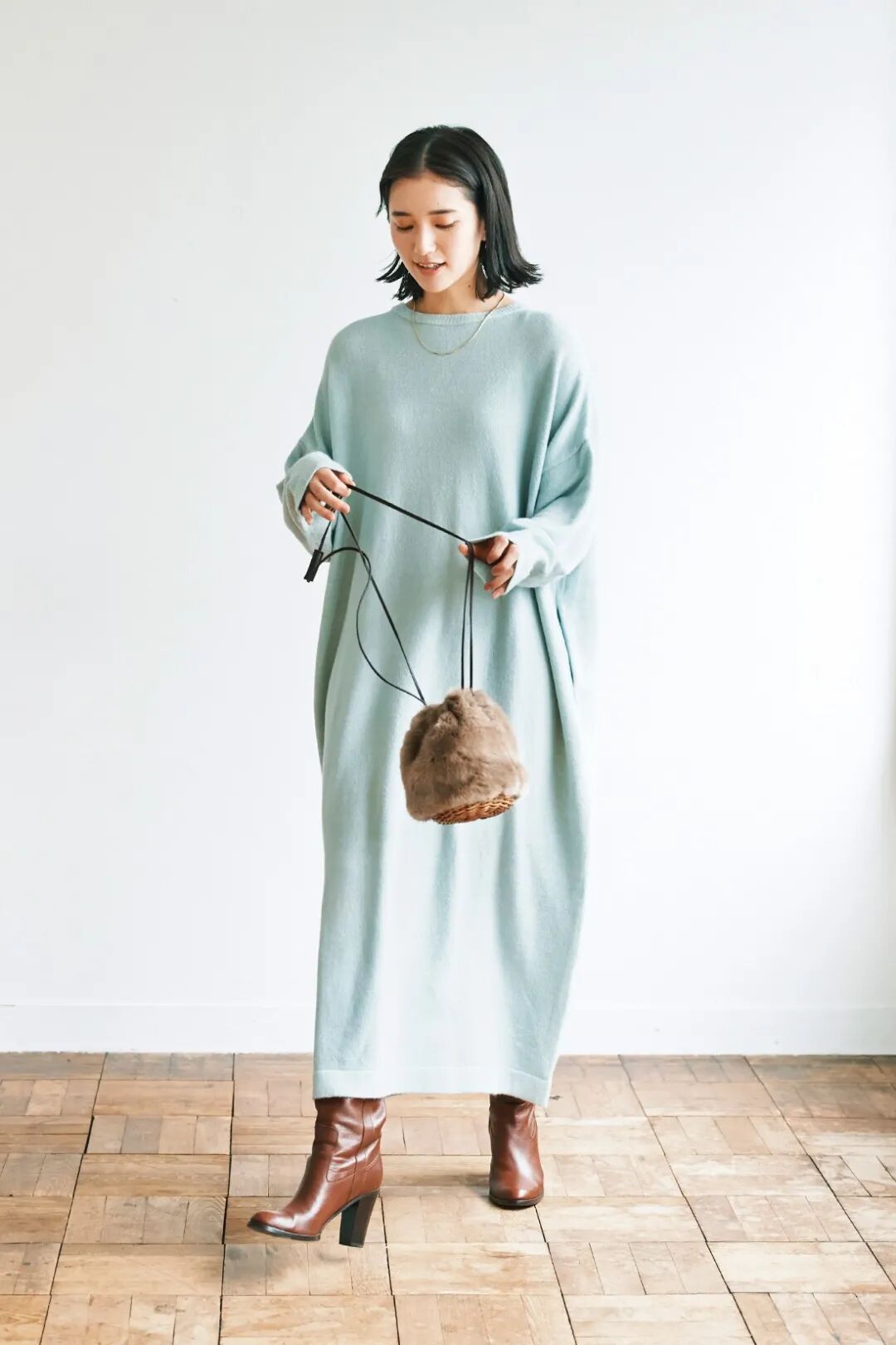 清凉的薄荷色与软糯温暖的针织裙融为一体,反差感在此交融,带来意想不到的时髦意味。