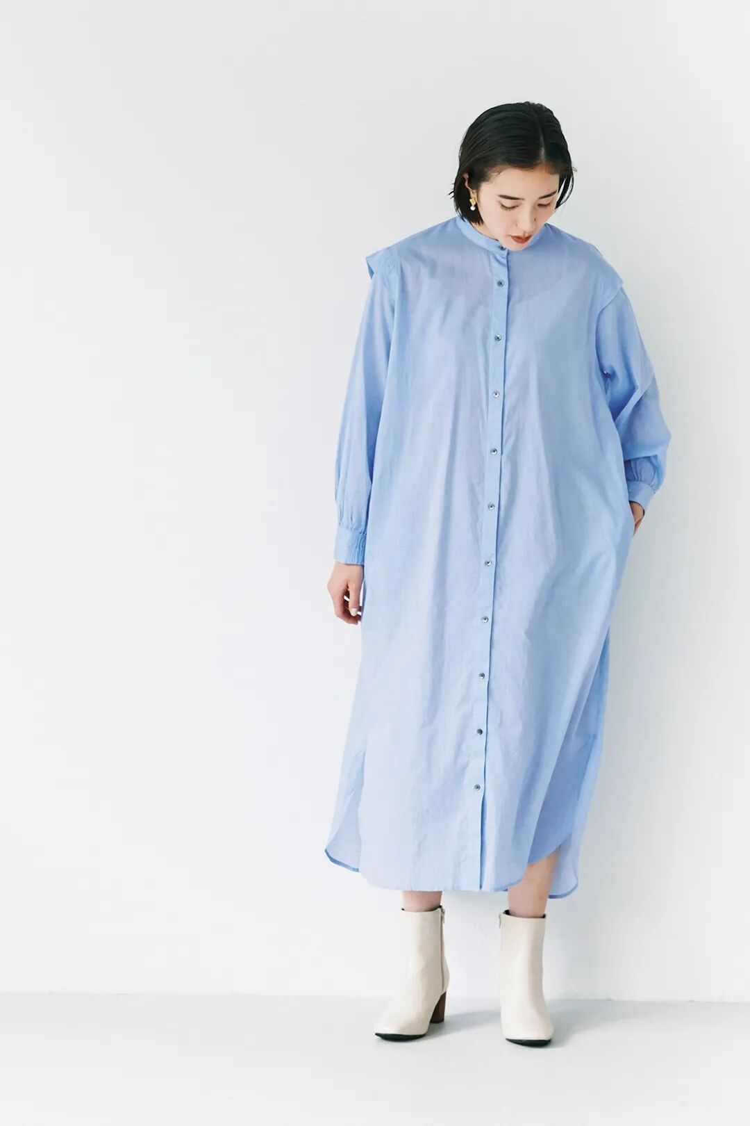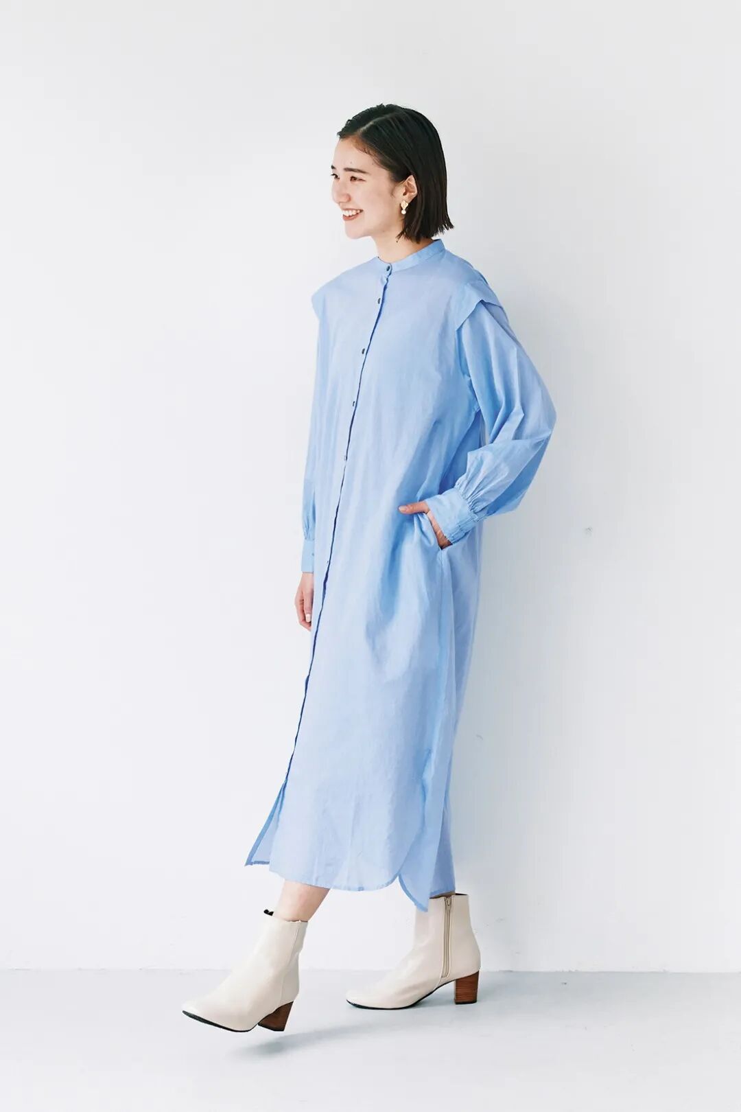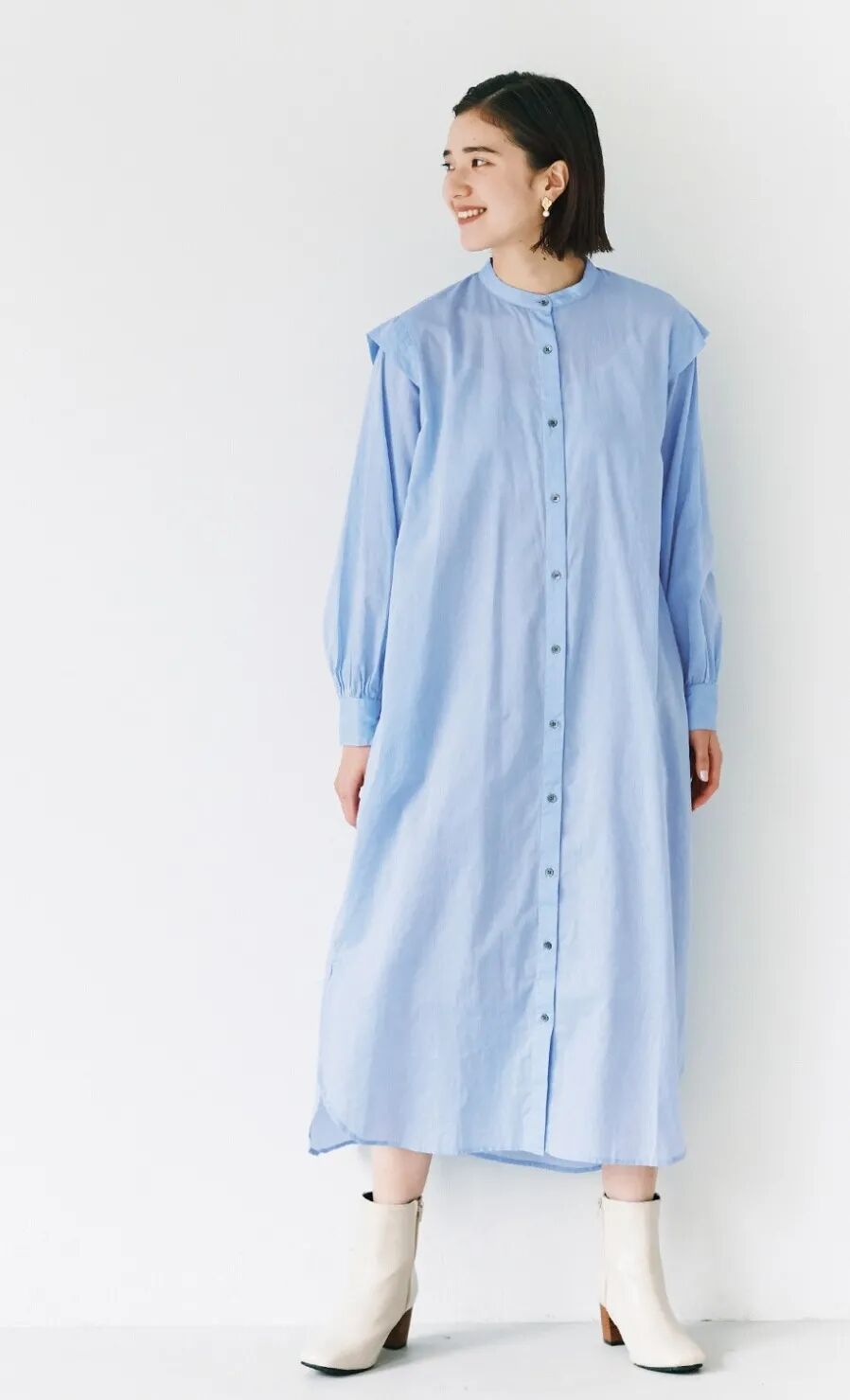 长款蓝色衬衫裙洁净知性,透露出骨子里的文艺气息,搭配白色短靴增添时髦味道。