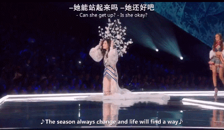 第五次登上维密舞台的奚梦瑶,被纱裙绊倒,在地上趴了十秒钟,才被超模Gizele扶起。