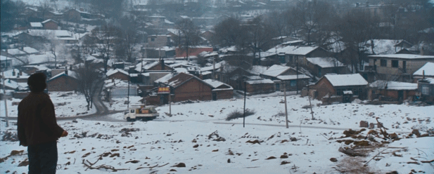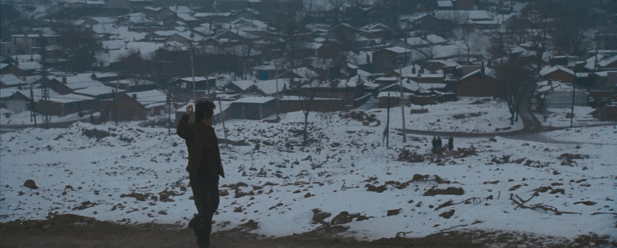 左边,是代表美好希望的太阳新城,右边,是没了土地的家。一左一右,也象征着未来和过去,他行走在中间,似乎一个都到达不了。