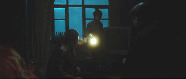 树拿着手电筒,像照妖镜一样使得二猪现出了原型,匍匐在地连连跪拜。